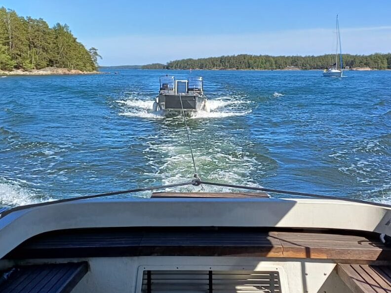 Autamme veneesi hinauksessa korjattavaksi tarvittaessa.